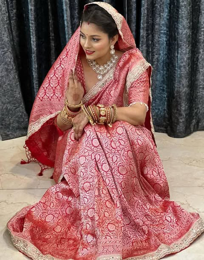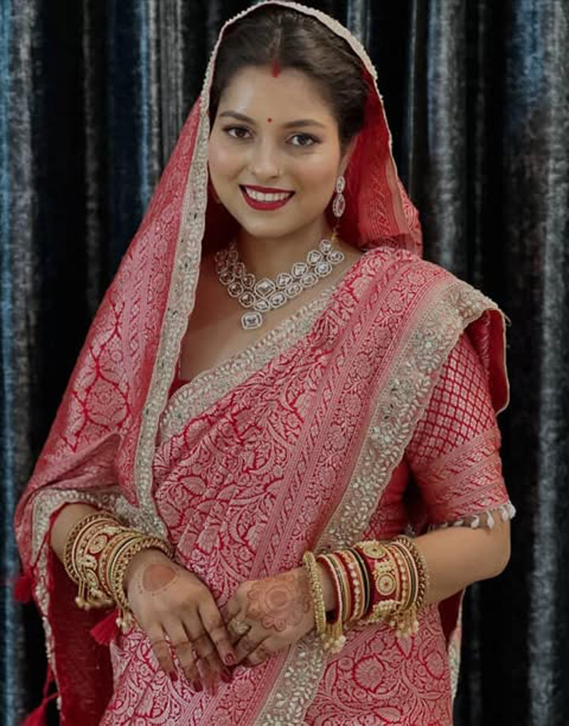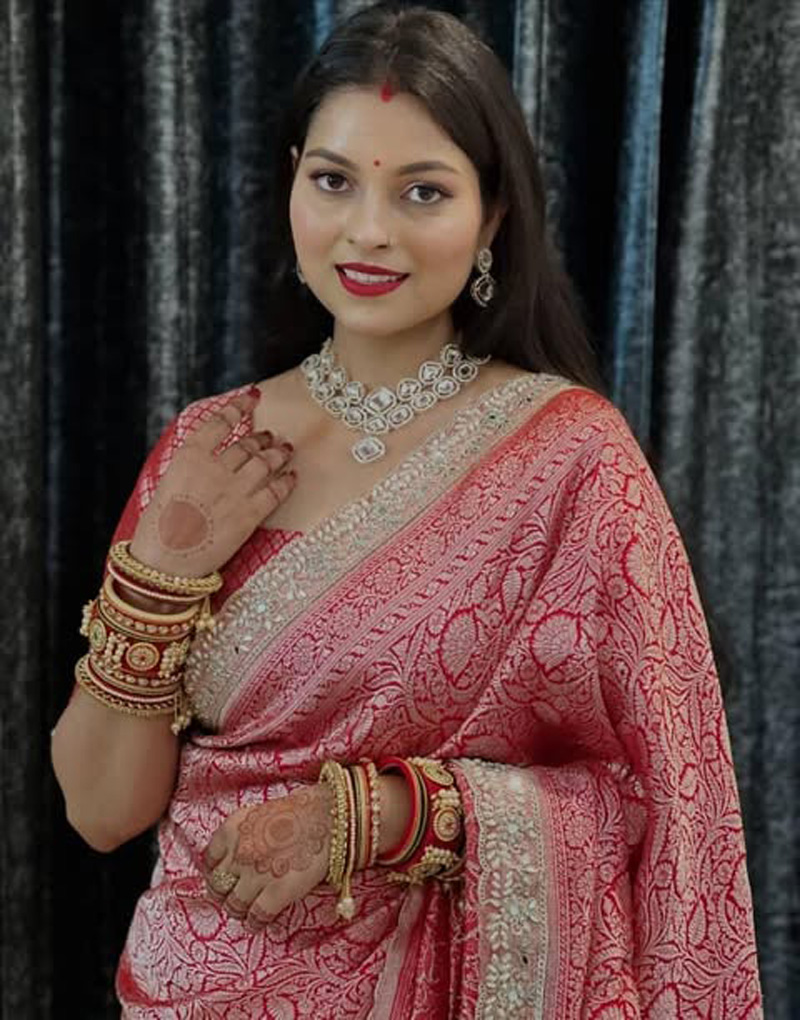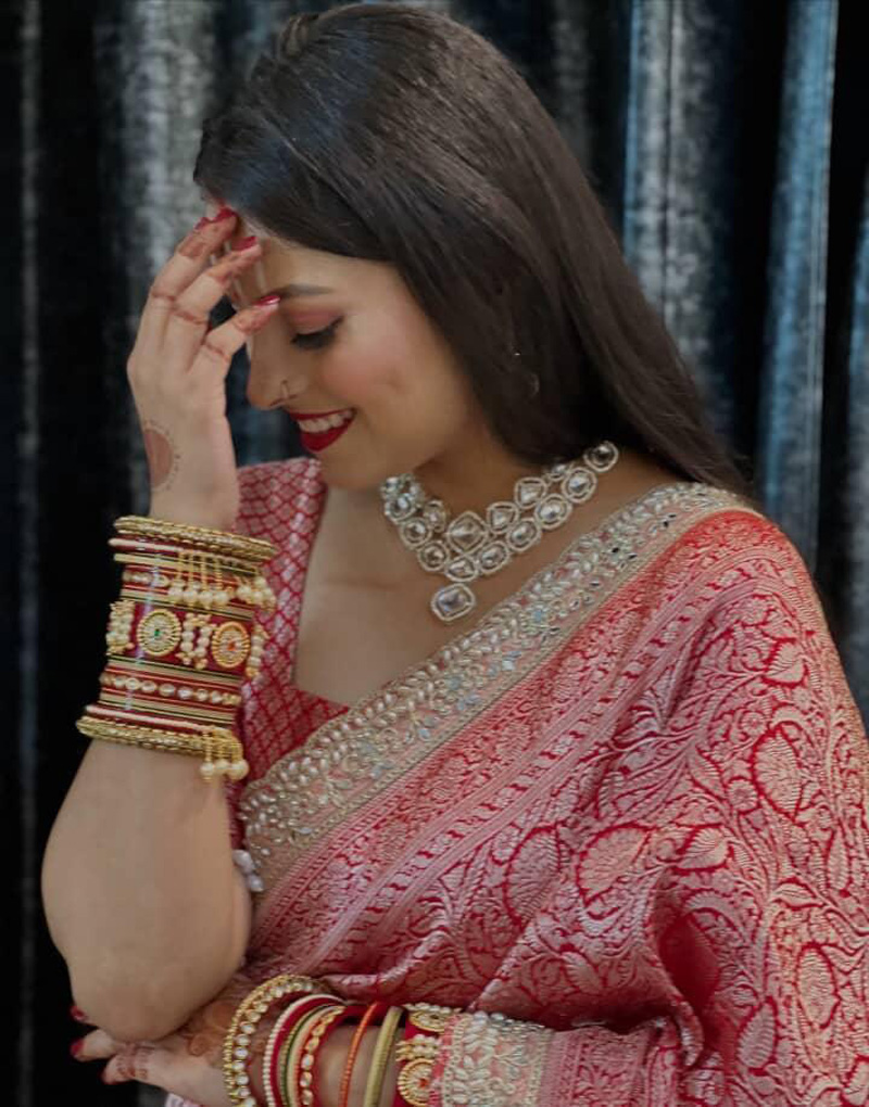 This saree is not just a garment—it is a celebration of Indian heritage, combining the richness of handloom tradition with contemporary bridal elegance. Pair it with heirloom jewelry, a sleek bun, and a radiant smile to complete the bridal look that’s both majestic and eternally memorable.