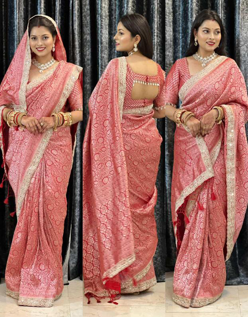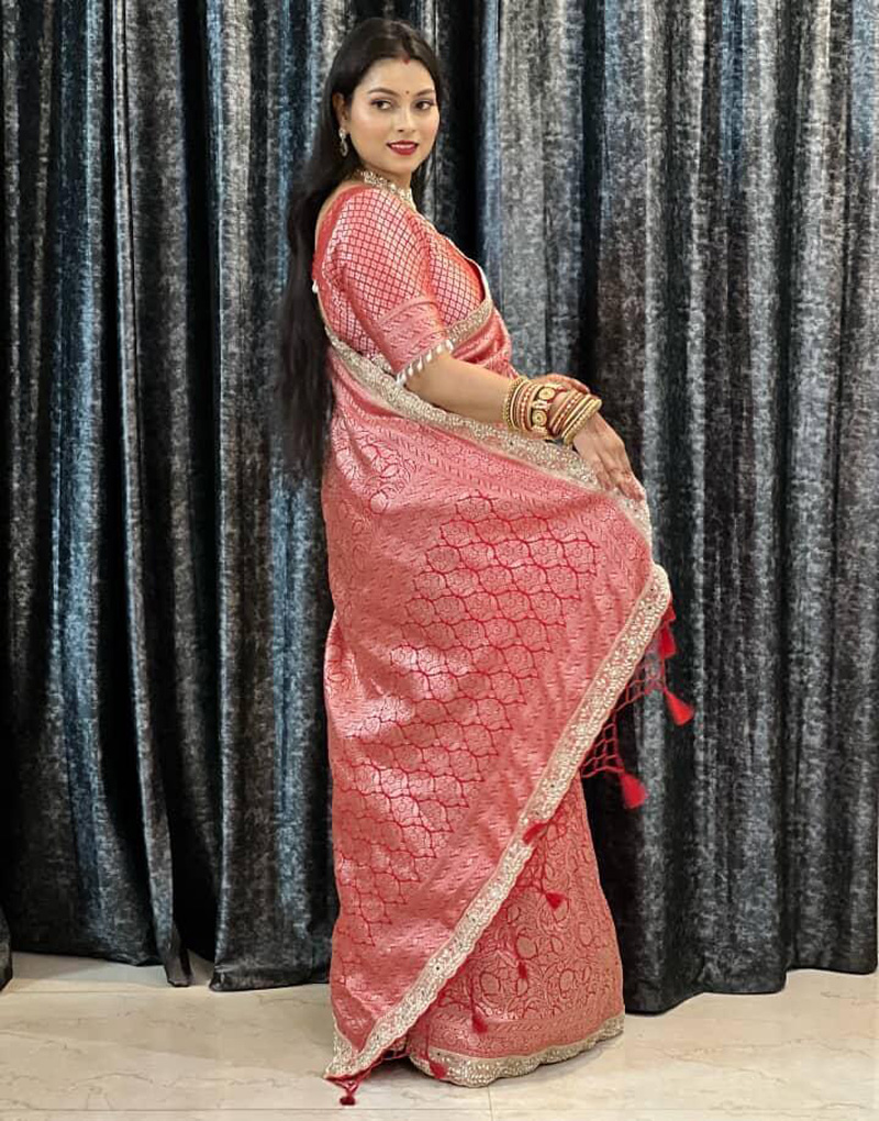 Red Banarasi Katan Brocade Silk Saree featuring intricate woven brocades and a grand pallu with elegant tassels. The diamond weave brocade border is beautifully adorned with delicate pearl and stone lace, perfect for a regal bridal look.