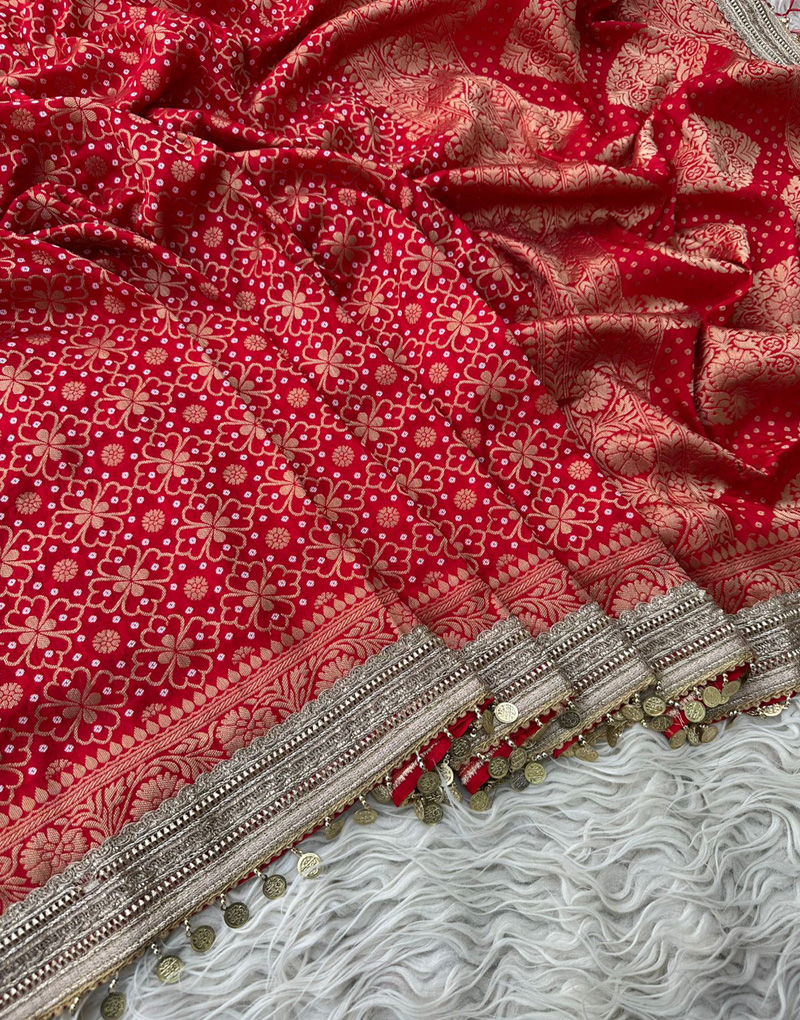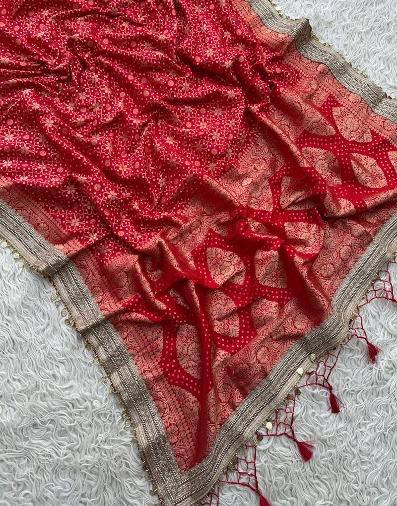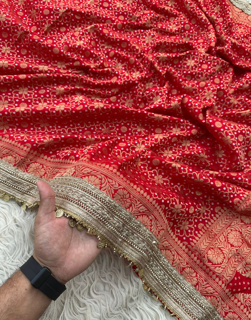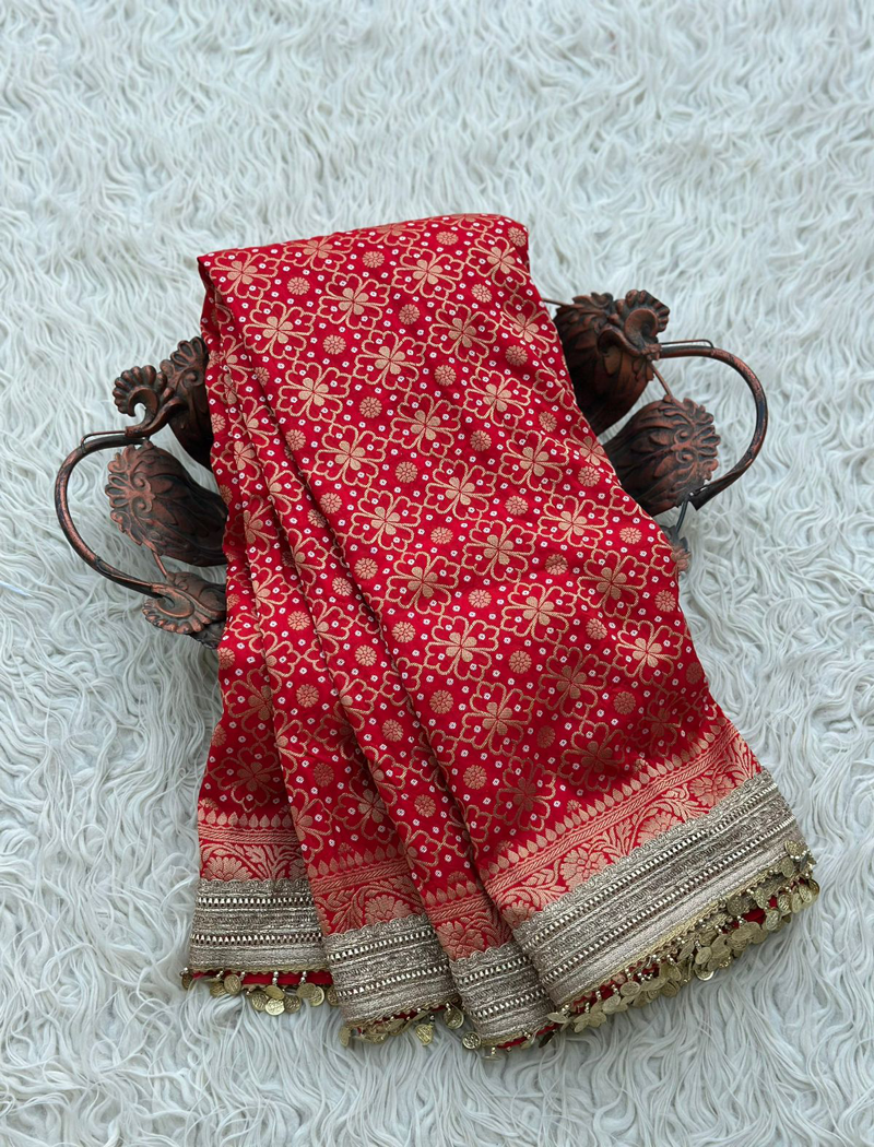 A vibrant Bandhej saree crafted in soft semi-georgette fabric, beautifully adorned with delicate coin lace work along the border—blending traditional charm with a hint of boho elegance.