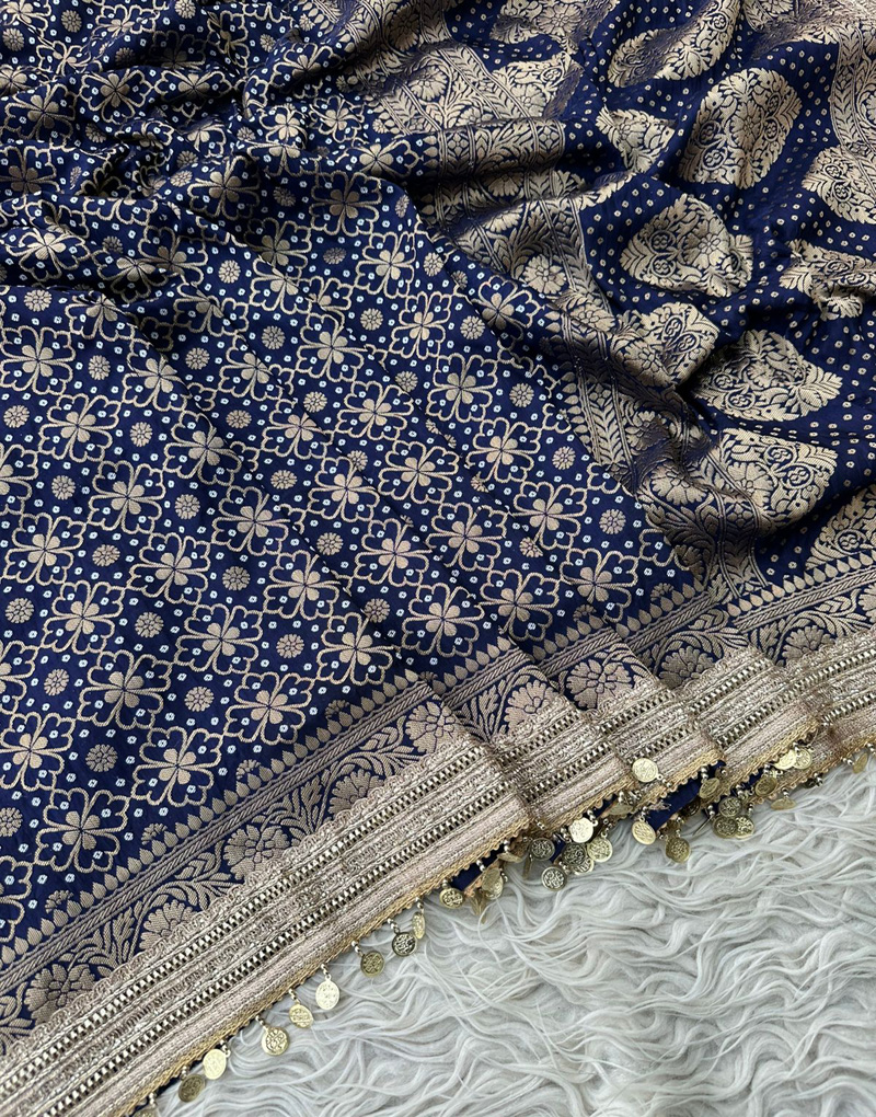 A vibrant Bandhej saree crafted in soft semi-georgette fabric, beautifully adorned with delicate coin lace work along the border—blending traditional charm with a hint of boho elegance.
