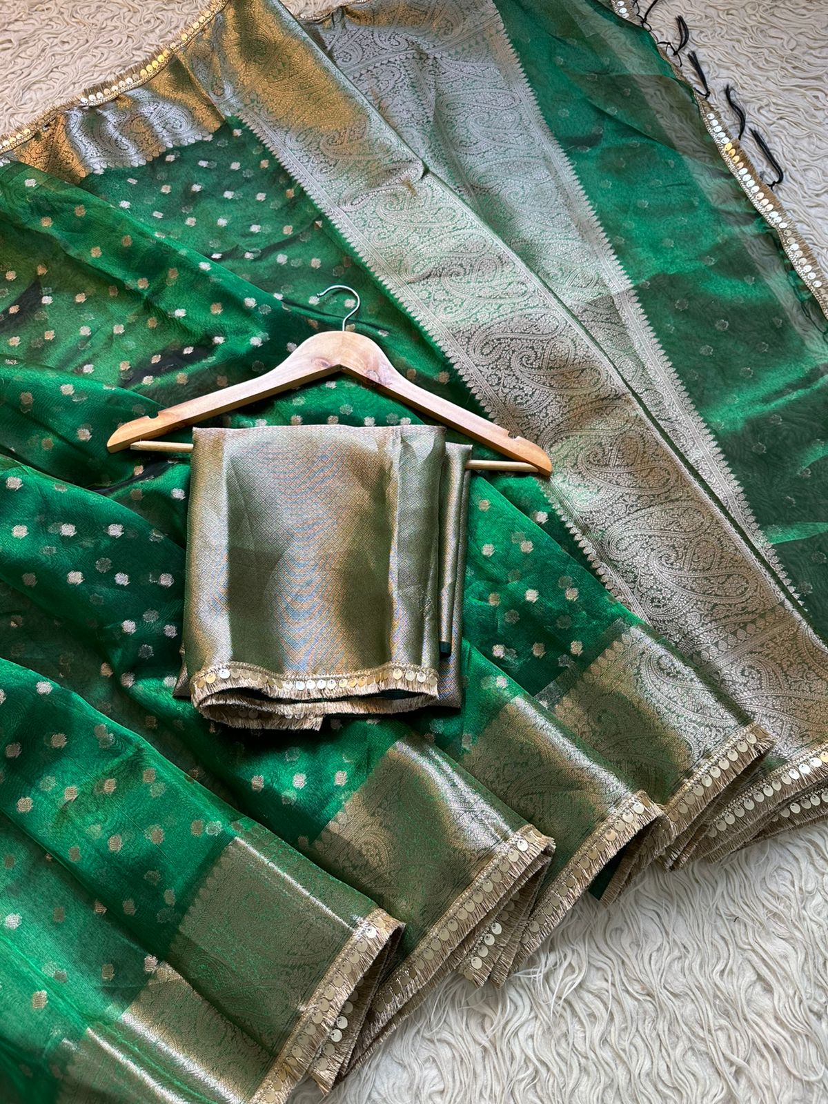Adding our signature touch, we’ve enhanced the saree with a specially designed Gotta Patti lace—a delicate yet striking detail that brings a contemporary twist to this classic drape. The pallu is a grand Banarasi highlight in itself, detailed with ornate motifs and bordered on both sides to complete the royal ensemble.