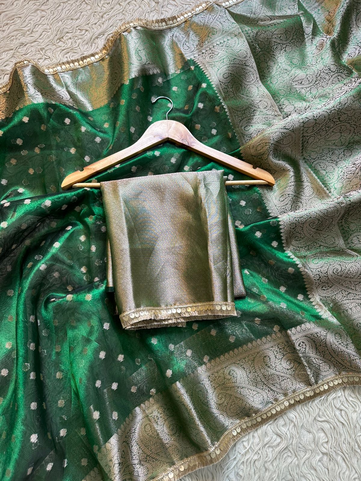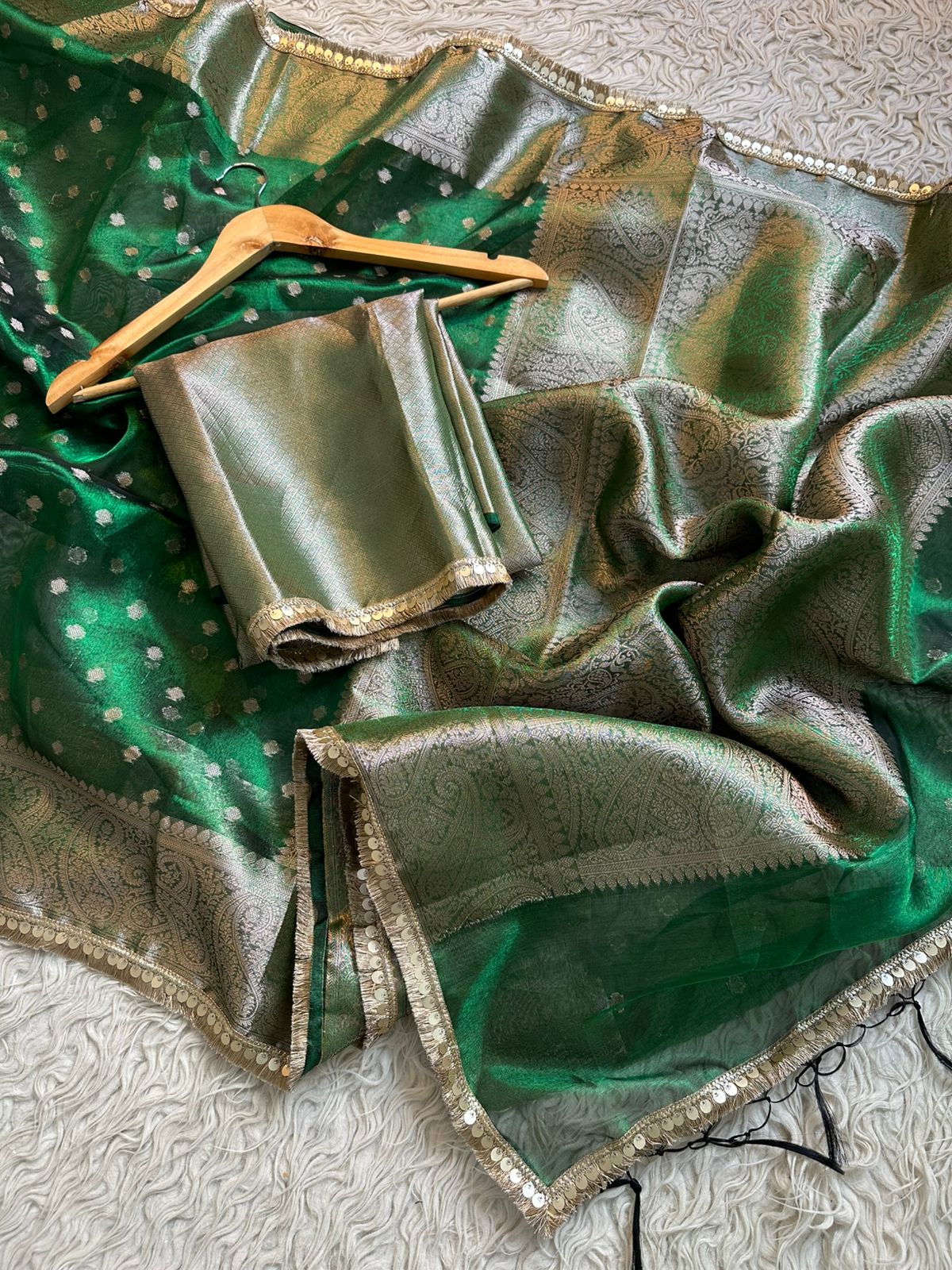 Step into timeless elegance with our Designer Banarasi Tissue Maharani Silk Saree in a stunning dual-tone combination of Rani Pink and Royal Blue. Crafted from premium quality tissue silk, this saree radiates a royal sheen and fluid grace that makes it perfect for weddings, festive occasions, and grand celebrations.