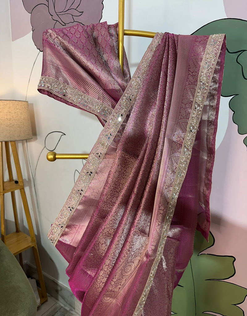 Exude elegance in this exquisite designer Kanjeevaram brocade tissue silk saree, featuring intricate pearl and stone lace work. The richly adorned pallu is highlighted with delicate jhalar pearl lace, adding a regal finish to this timeless drape. Perfect for weddings, festive occasions, and grand celebrations.