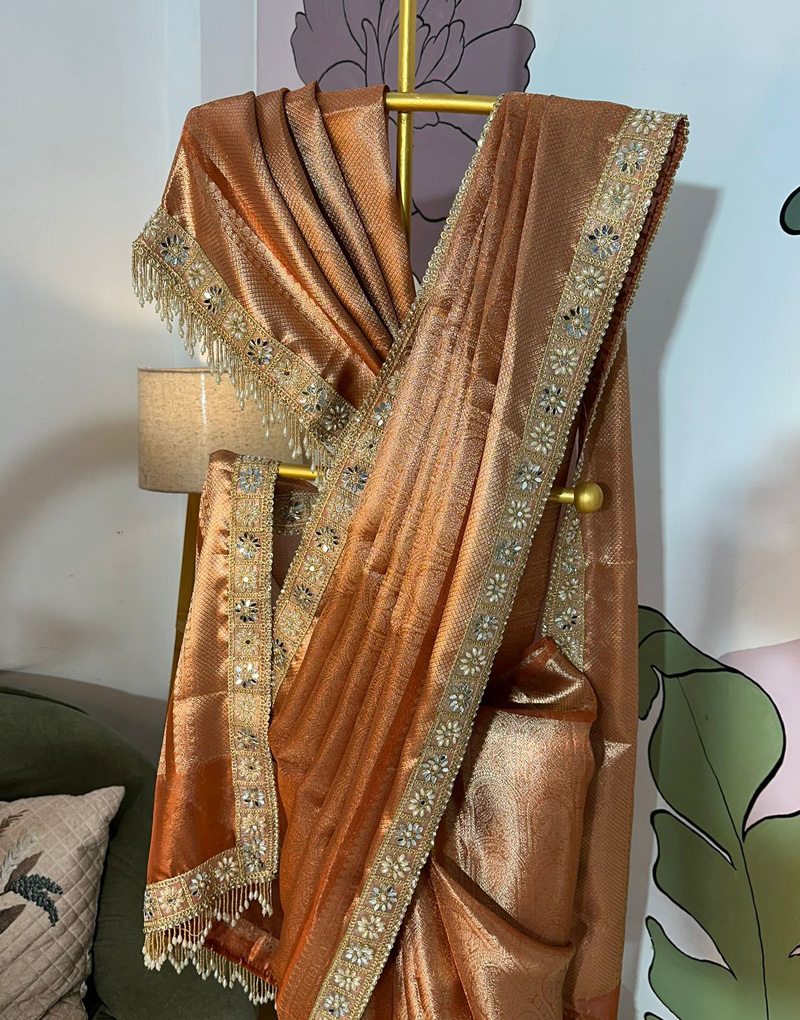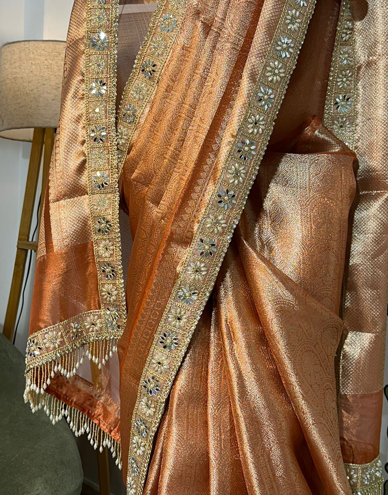Exude elegance in this exquisite designer Kanjeevaram brocade tissue silk saree, featuring intricate pearl and stone lace work. The richly adorned pallu is highlighted with delicate jhalar pearl lace, adding a regal finish to this timeless drape. Perfect for weddings, festive occasions, and grand celebrations.
