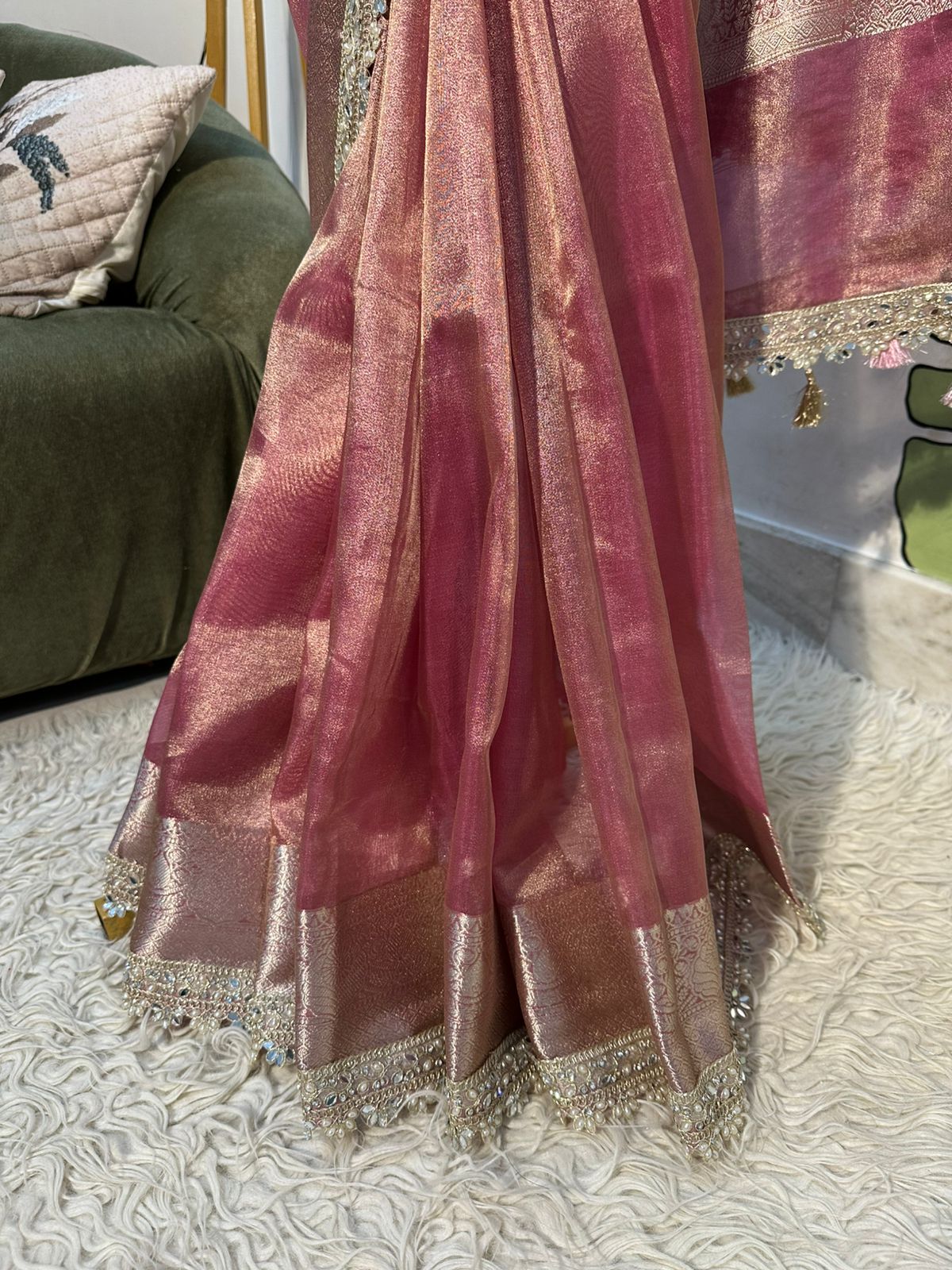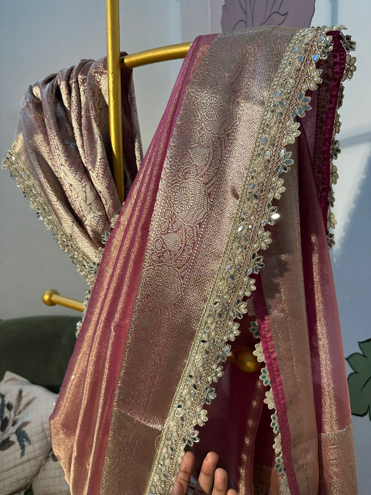 Adding our signature touch, we’ve enhanced the saree with a specially designed Gotta Patti lace—a delicate yet striking detail that brings a contemporary twist to this classic drape. The pallu is a grand Banarasi highlight in itself, detailed with ornate motifs and bordered on both sides to complete the royal ensemble.