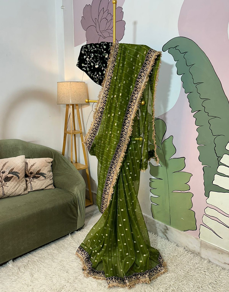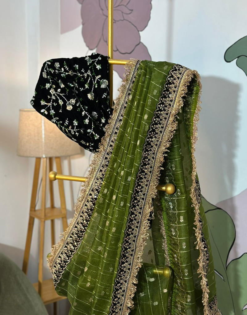 To complete the ensemble, the saree comes with a statement Gota Patti blouse piece in black velvet fabric. Adorned with an intricately woven jaal pattern, the blouse design complements the saree’s border and adds a regal charm that ties the whole look together. This contrast pairing brings a designer finish that’s bold, elegant, and perfect for those who love refined detailing with a modern twist.