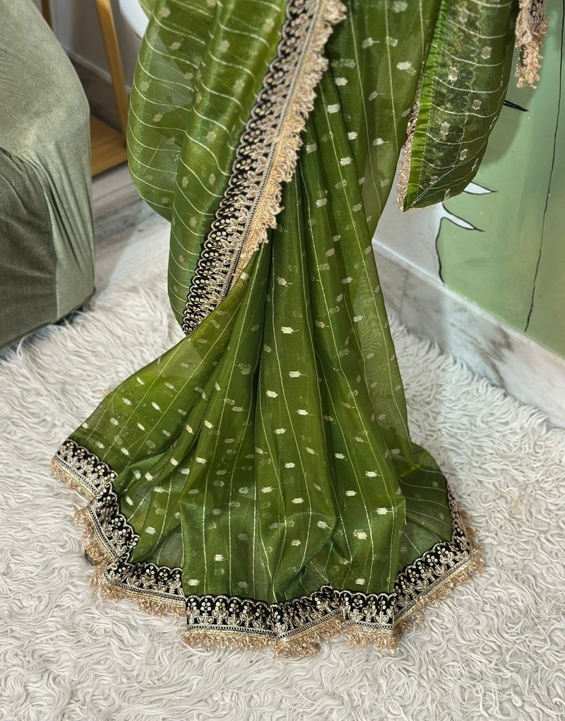 Elevate your ethnic wardrobe with our Designer Tissue Saree, a luxurious blend of classic elegance and bold contrast detailing. Crafted from high-quality tissue fabric, the saree features an all-over weave of delicate buti motifs arranged in subtle stripe patterns. The shimmery texture of the tissue adds a graceful sheen, making it ideal for festive occasions, weddings, or special evening events.